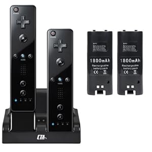 This charge station contains a two-space cradle that allows you to charge and rest two remotes, with or without Wii MotionPlus adapters connected, in an upright position. Also included are two sets of rechargeable 1800 mAh batteries, which are enclosed in a mold that you can attach to the back of your Wii Remote. The Dual Charger Station is powered by a USB cable that attaches from the AC adaptor connection (located on the back of the device) to a USB port on the Wii Console or on a computer. A first of its kind, this product contains both the standard USB-DC power cable and a USB-Wall outlet plug that allows you to connect to an electrical wall outlet! This device is made specifically to eliminate constant and costly AA battery usage with eco-friendly rechargeable technology. After a full charge you’ll have long-lasting game play for approximately 13-20 hours! Pack includes: 30 inch USB cable included; Two 1800 mAh Rechargeable Batteries; One base Station to recharge one or two WiiTM Remotes. Specification: Capacity: 1800 mAh; Game play after charge: approximately 13-20 hours; Charging time: 7 hours